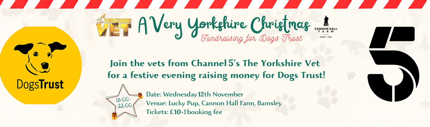 Join the vets from Channel 5’s The Yorkshire Vet for a festive evening raising money for Dog’s Trust. This will take place in our Lucky Pup cafe at Cannon Hall Farm, 6pm – 10pm on 12th November 2025.